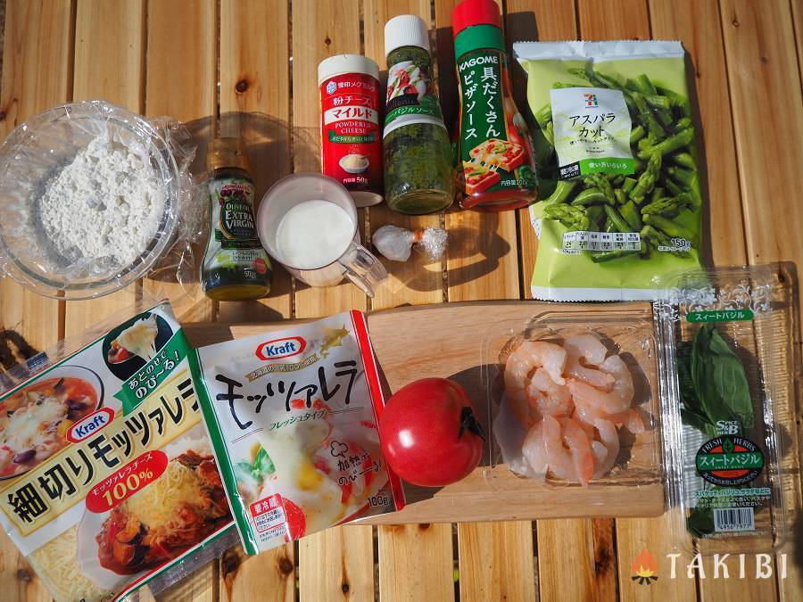 ピザの具材(今回はトマト、バジル、えび、アスパラを使いました。)