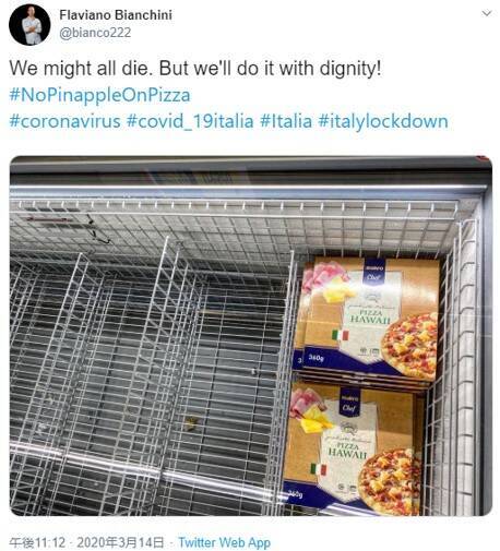 投稿主は、名前からしてイタリア系であることがほぼ確定なフラヴィアーノ・ビアンチーニさん。てっきり、医療崩壊している病院内の画像かなにかかと思いきや、そこには「ピッツァ・ハワイ」と書かれた冷凍ピザの画像が。
